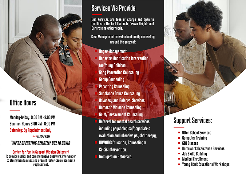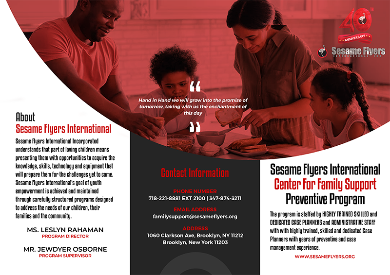 Our services are open to families in the East Flatbush, Crown Heights, and Canarsie neighborhoods, and we offer daytime, evening, and weekend appointments to better serve our clients. Each family has an assigned caseworker who coordinates counseling, social services, and referrals, empowering and strengthening families through growth and awareness. We offer a range of services, including entitlements/benefits counseling, vocational training and GED classes, parenting skills workshops, adolescent support, grief/bereavement issues, intensive therapy, and more. Contact us at (718) 221-8881 or cfs@sesameflyers.org to learn more.